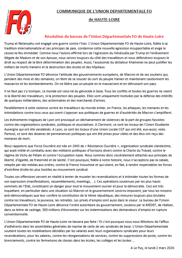 Résolution du bureau de l’Union Départementale du lundi 2 mars